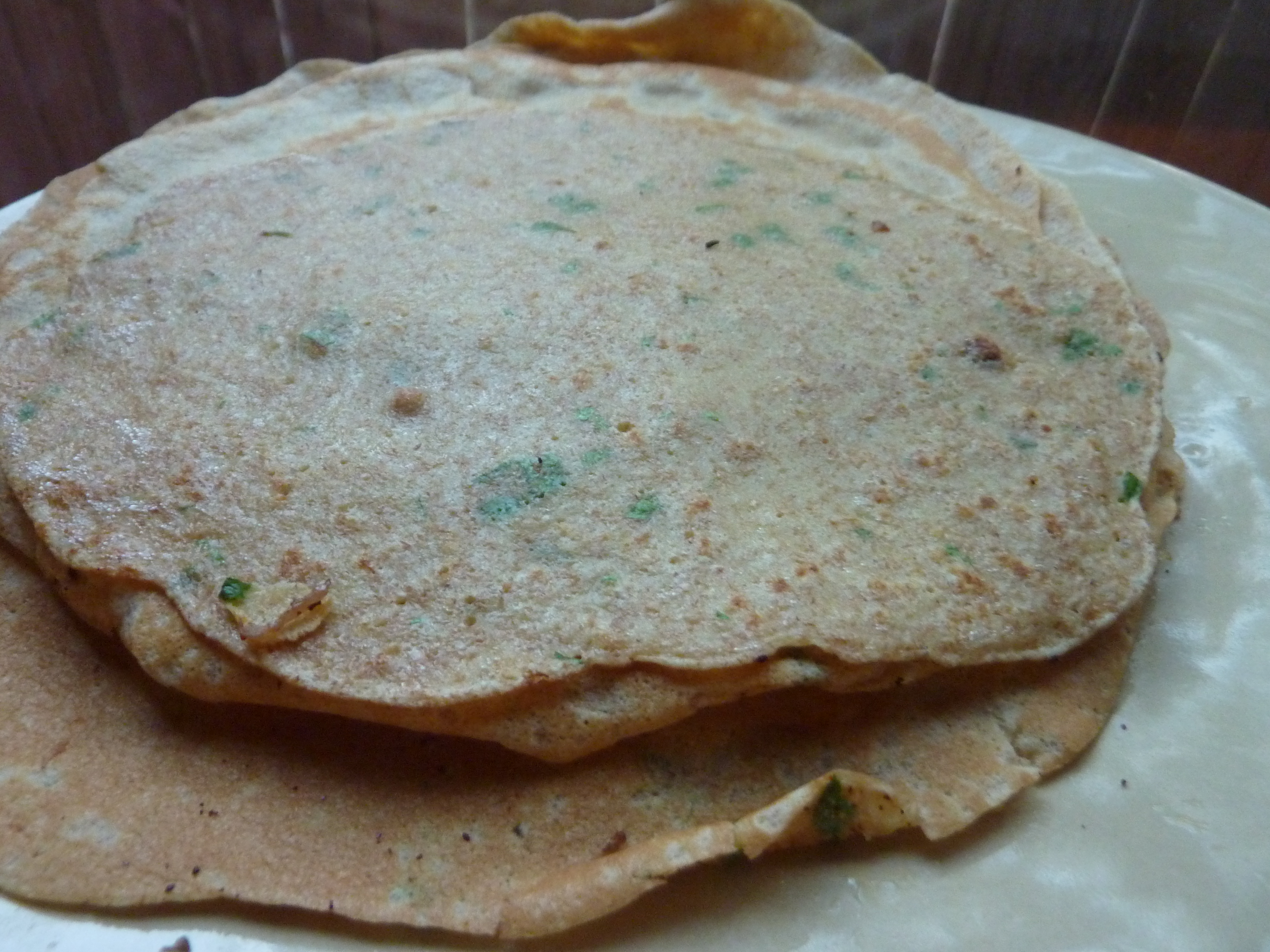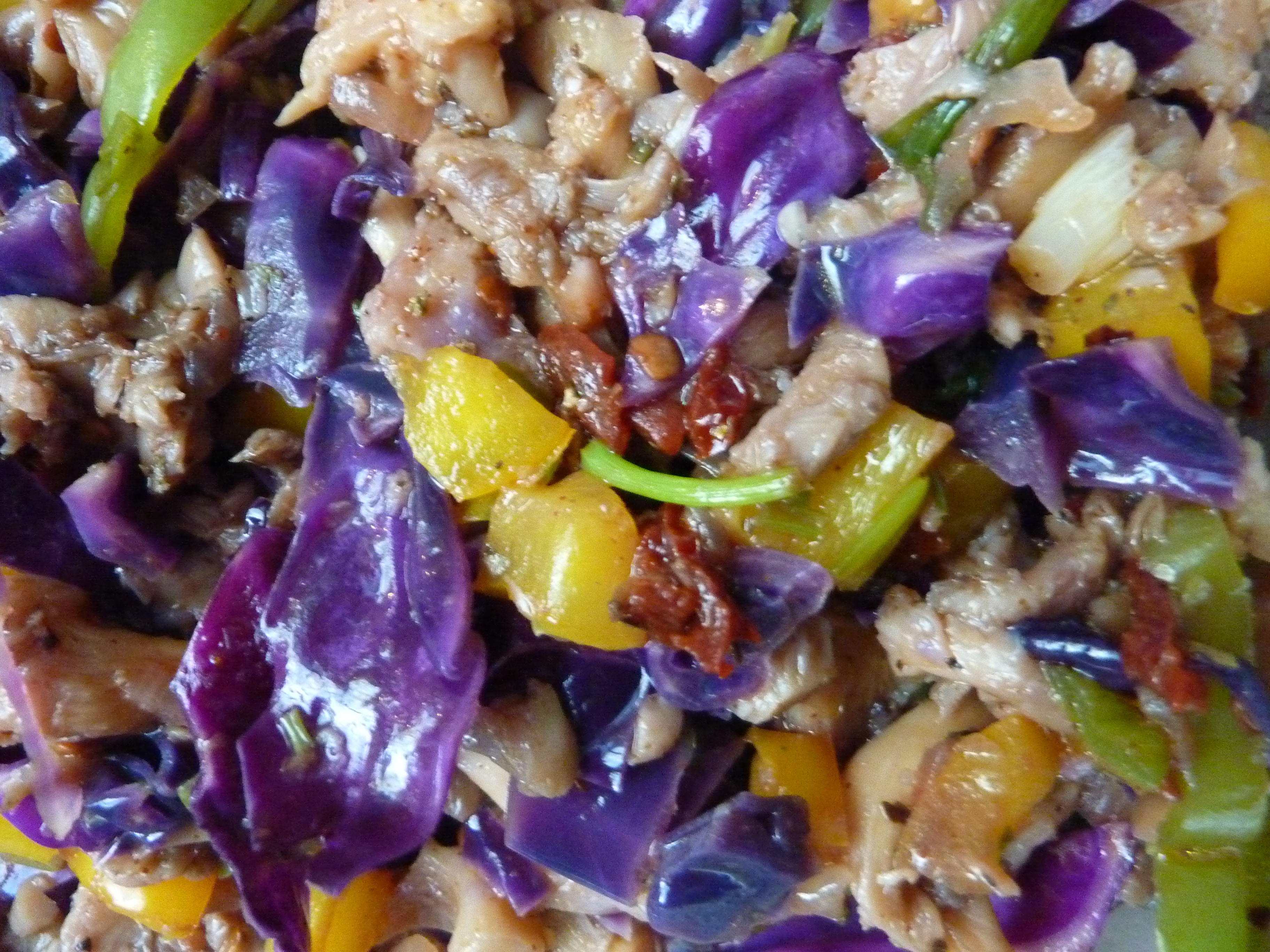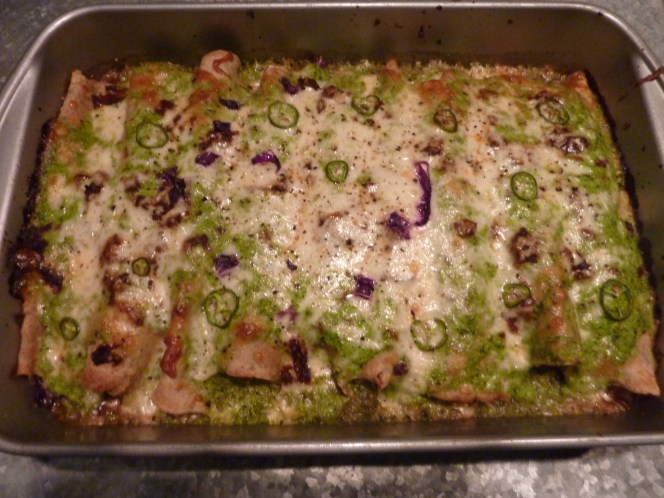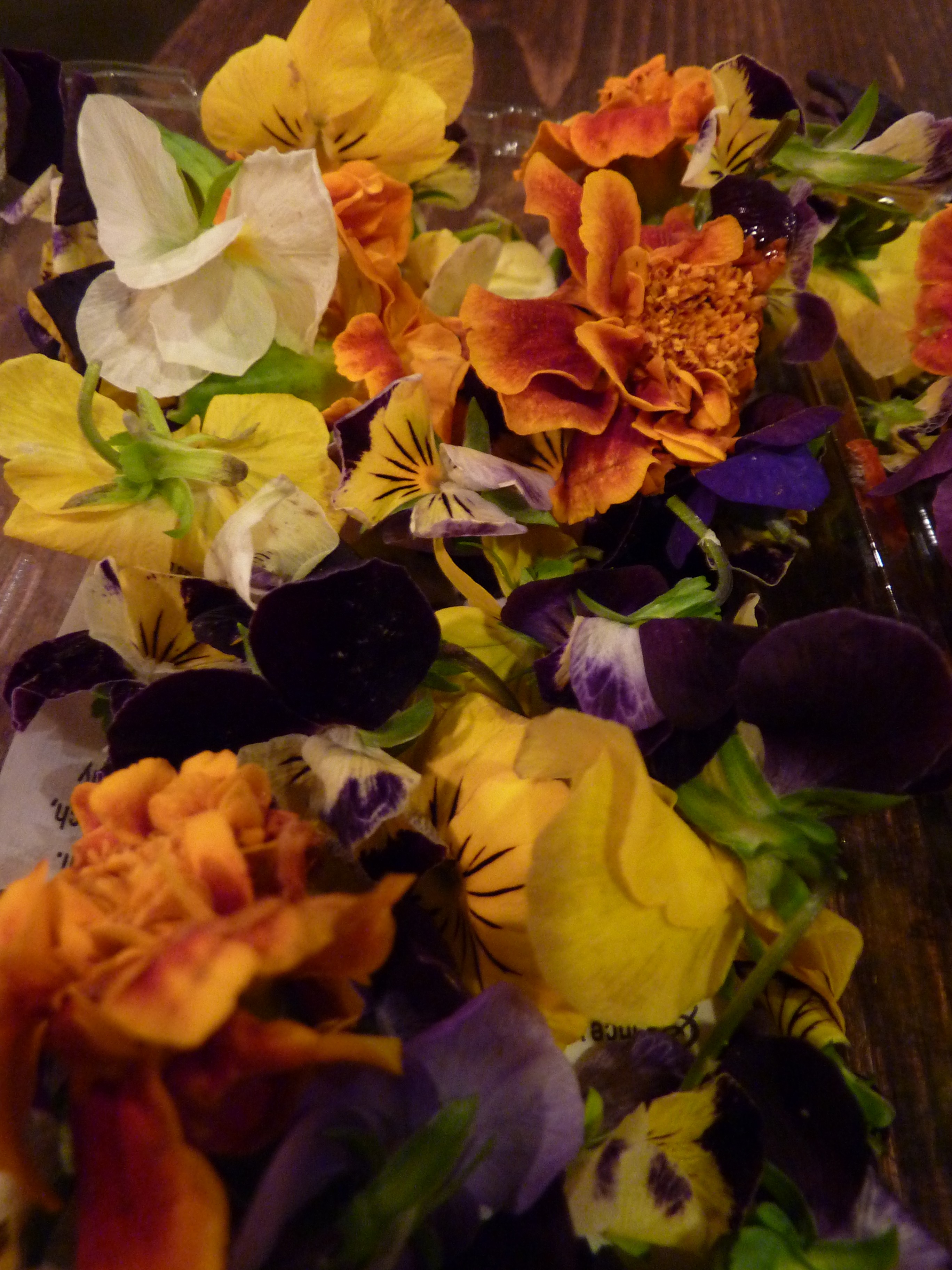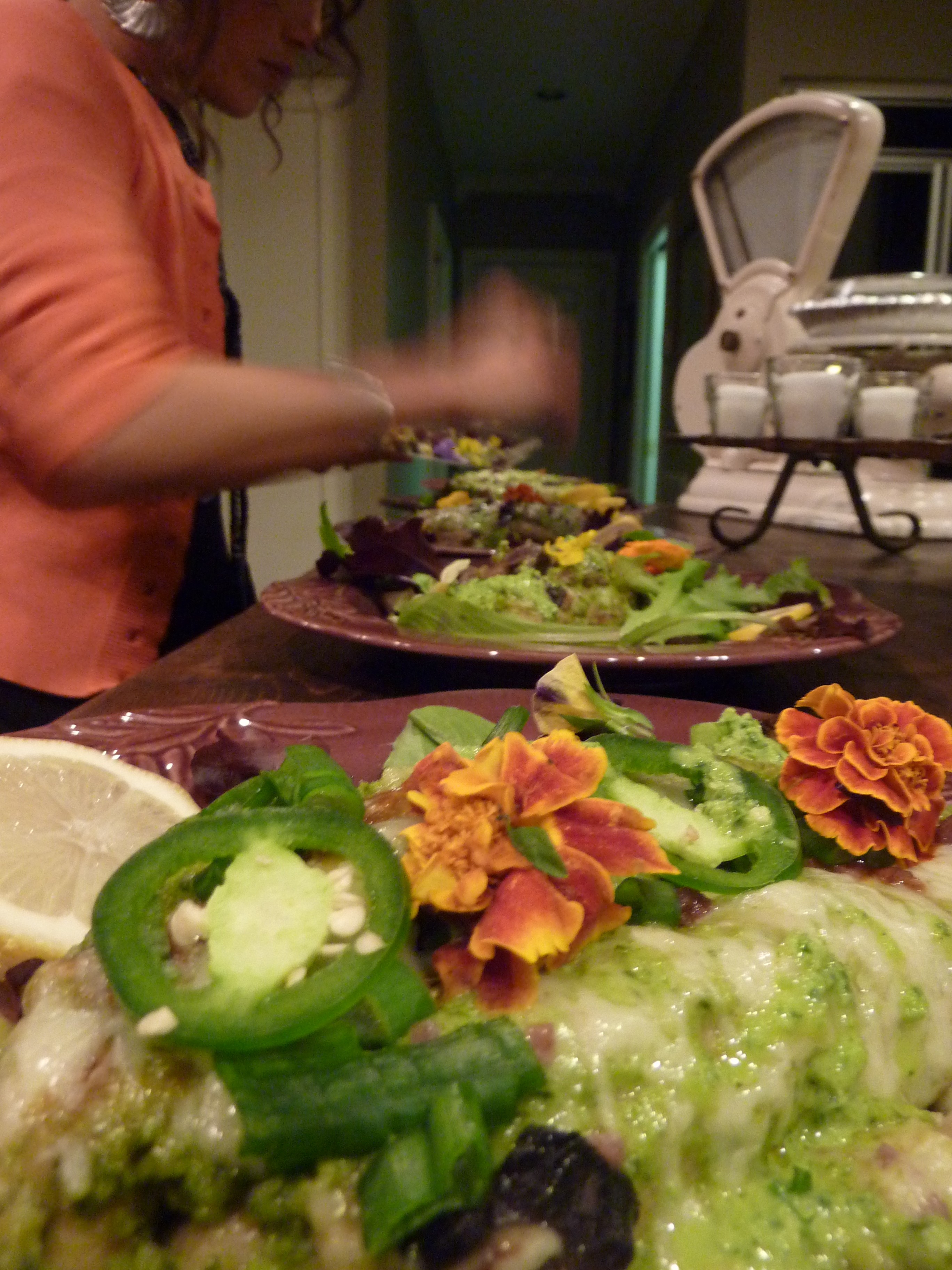 Main course: Whole wheat and cilantro crepes, stuffed with oyster mushrooms, purple cabbage, yellow bell peppers, and chipotle adobo sauce, smothered in poblano pepper cream and topped with slice jalapeños, edible flowers and citrus.