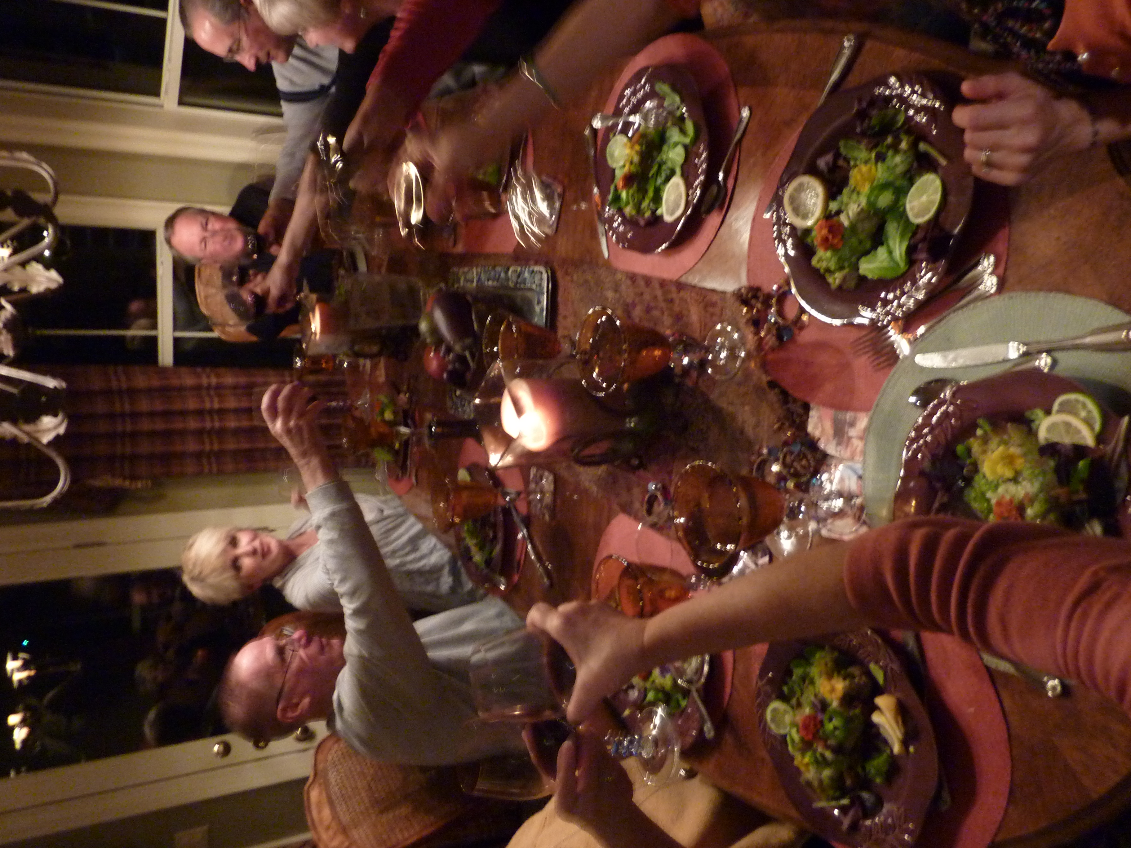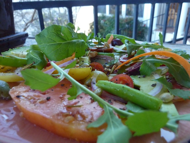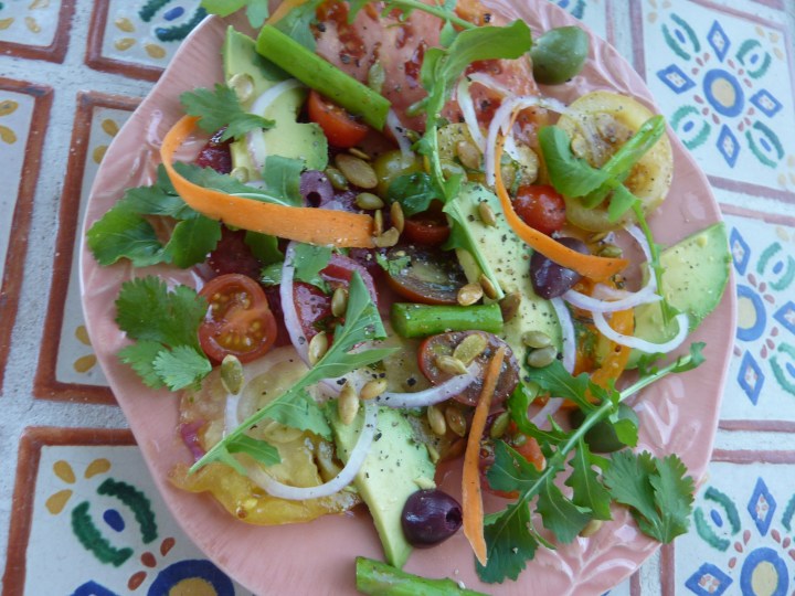 First course: Fresh marinated heirloom tomatoes, cherry tomatoes, sliced avocado, shaved carrots and red onion, blanched asparagus, kalamata and butter olives, toasted pumpkin seeds, arugula, and topped with cracked pepper, balsamic vinegar, and tarragon.