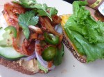Homemade hummus spread, thickly cut cucumbers, homemade kimchi, sliced red onion, korean red pepper flakes, shaved jalapeños, fresh cilantro, a drizzle of honey, farmers market lettuce, slice of Colby jack cheese, and toasted whole grain bread…yum!