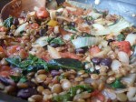 The fillings for the collard green wraps: onions, garlic, swiss chard, lentils, black beans, diced tomatoes, fresh oregano and thyme, sea salt, and jalapeño infused vinegar