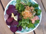 Kale and kohlrabi salad (kale, kohlrabi, beet juice, honey, lemon juice, sea salt, and pepper) topped with roasted beets drenched in lemon juice and more honey.