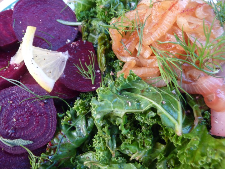 Kale and kohlrabi salad (kale, kohlrabi, beet juice, honey, lemon juice, sea salt, and pepper) topped with roasted beets drenched in lemon juice and more honey.