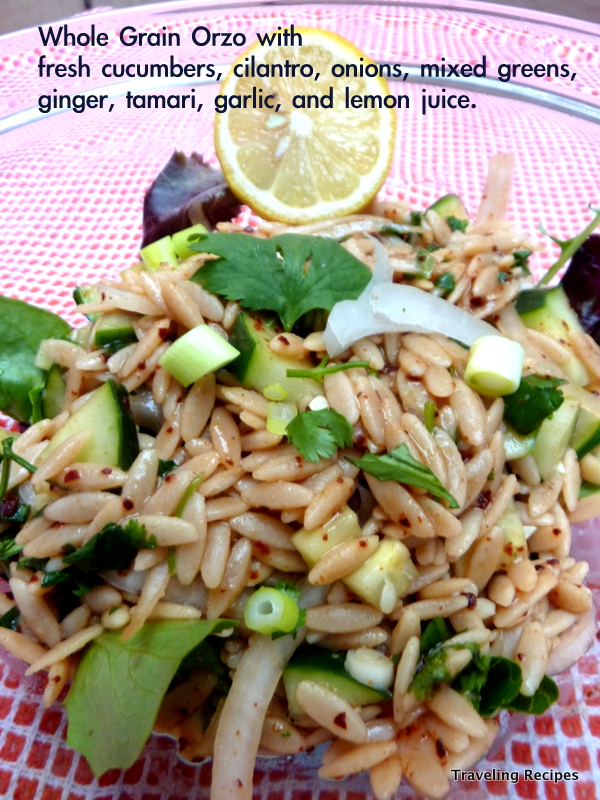 4) Drain orzo, add cilantro, cucumbers, onions, tamari (or amino liquids), squirt sriracha, 1 tsp peanut butter, and some lime juice. Stir together and set aside.