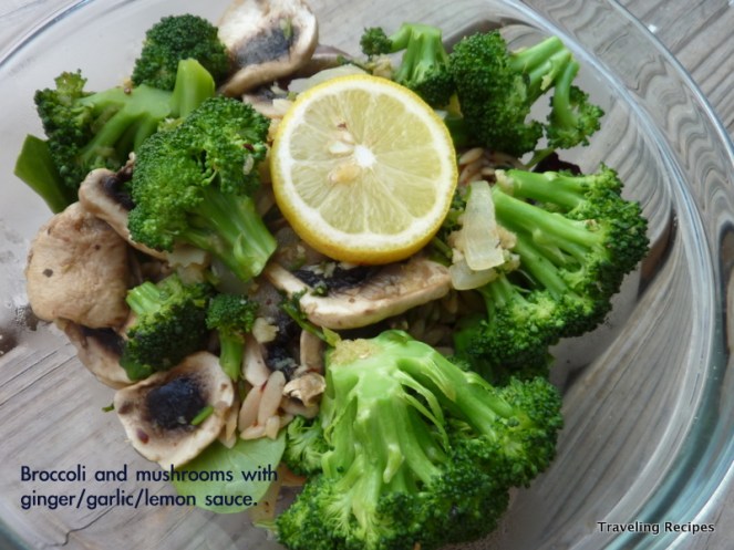 5)Lightly steam mushrooms and broccoli in broth with lid on for 4 minutes. Add fresh ginger, lemon juice, korean red pepper (or crushed red pepper)