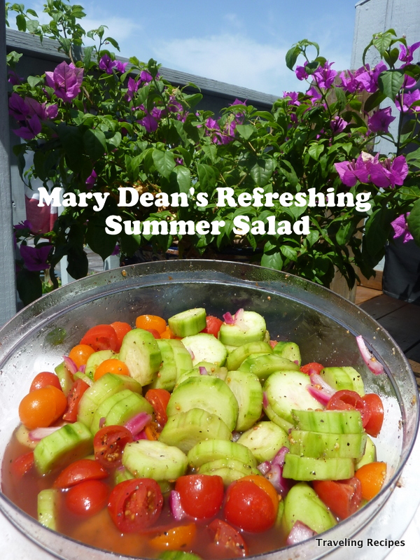 Sliced cucumbers, diced red onions, halved grape or cherry tomatoes, red wine vinegar, cracked pepper, and Mrs. Dash salt-free table blend seasonings!