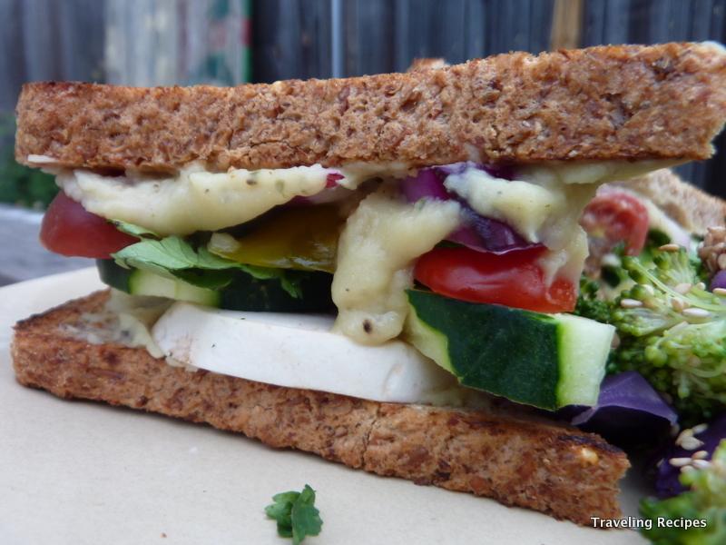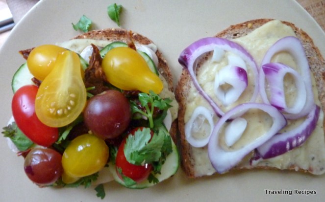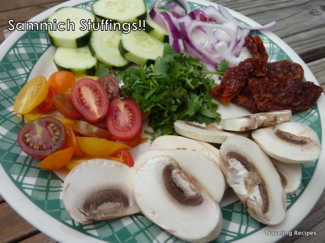 In the sammich: Fresh mushrooms, red onions, rehydrated sun-dried tomatoes, cilantro, homemade pickles, tomatoes, and love.