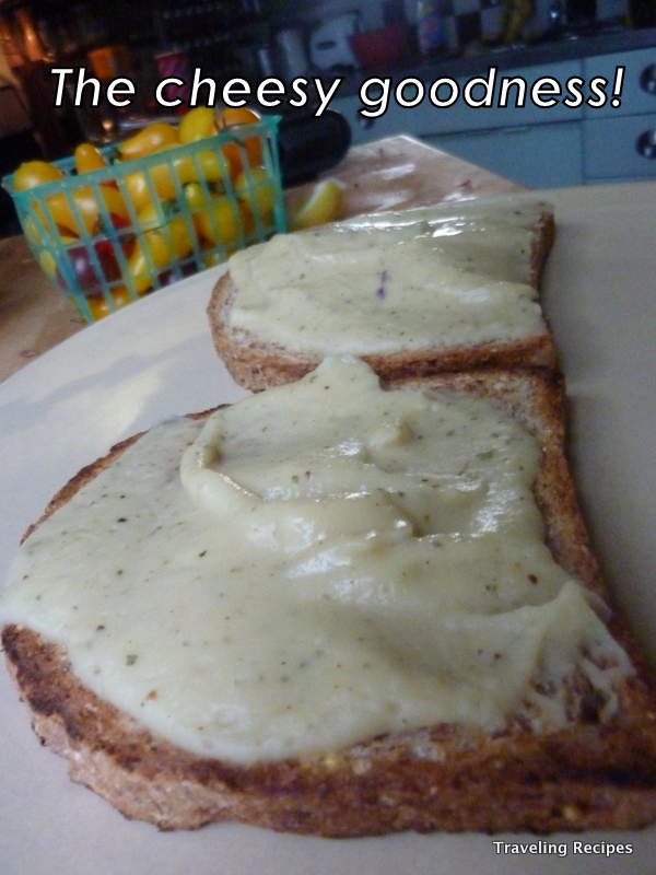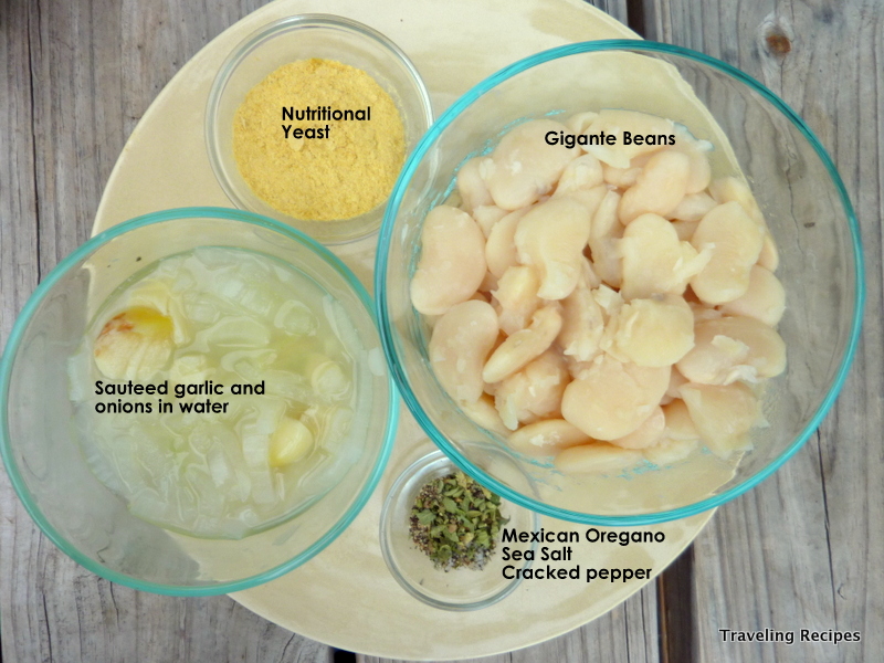 Ingredients for cheese: Gigante beans, nutritional yeast, onions, garlic, sea salt, and cracked pepper. (If you like spice, add crushed red pepper, cayenne, or sriracha!) Threw it all into the magic bullet and blended it up.