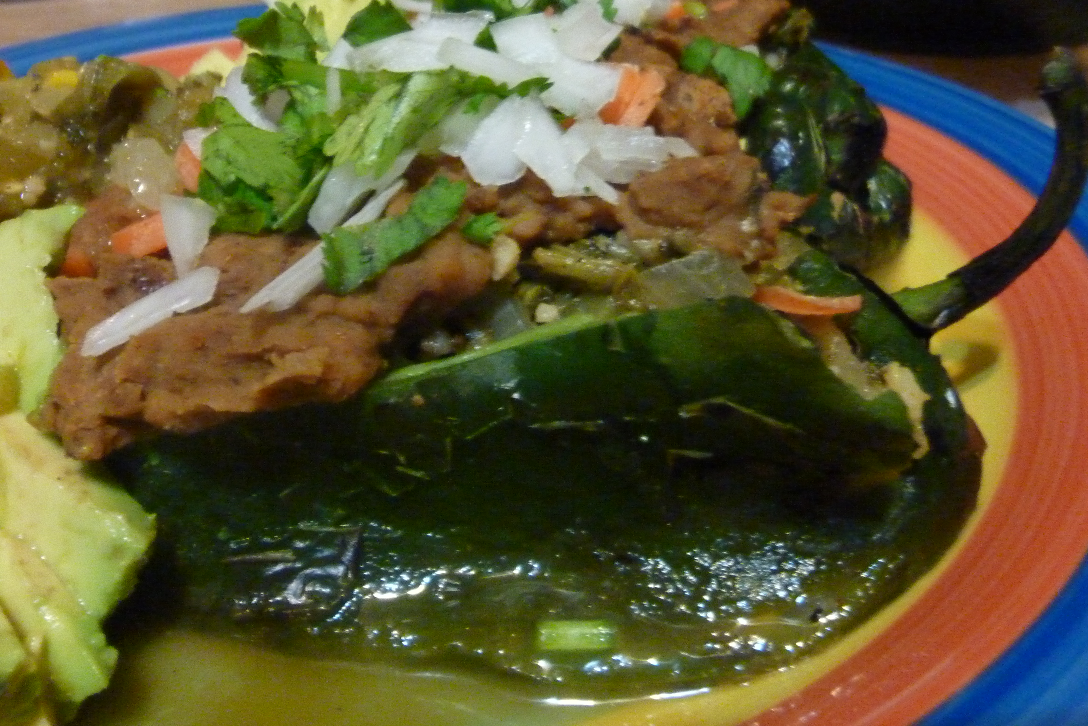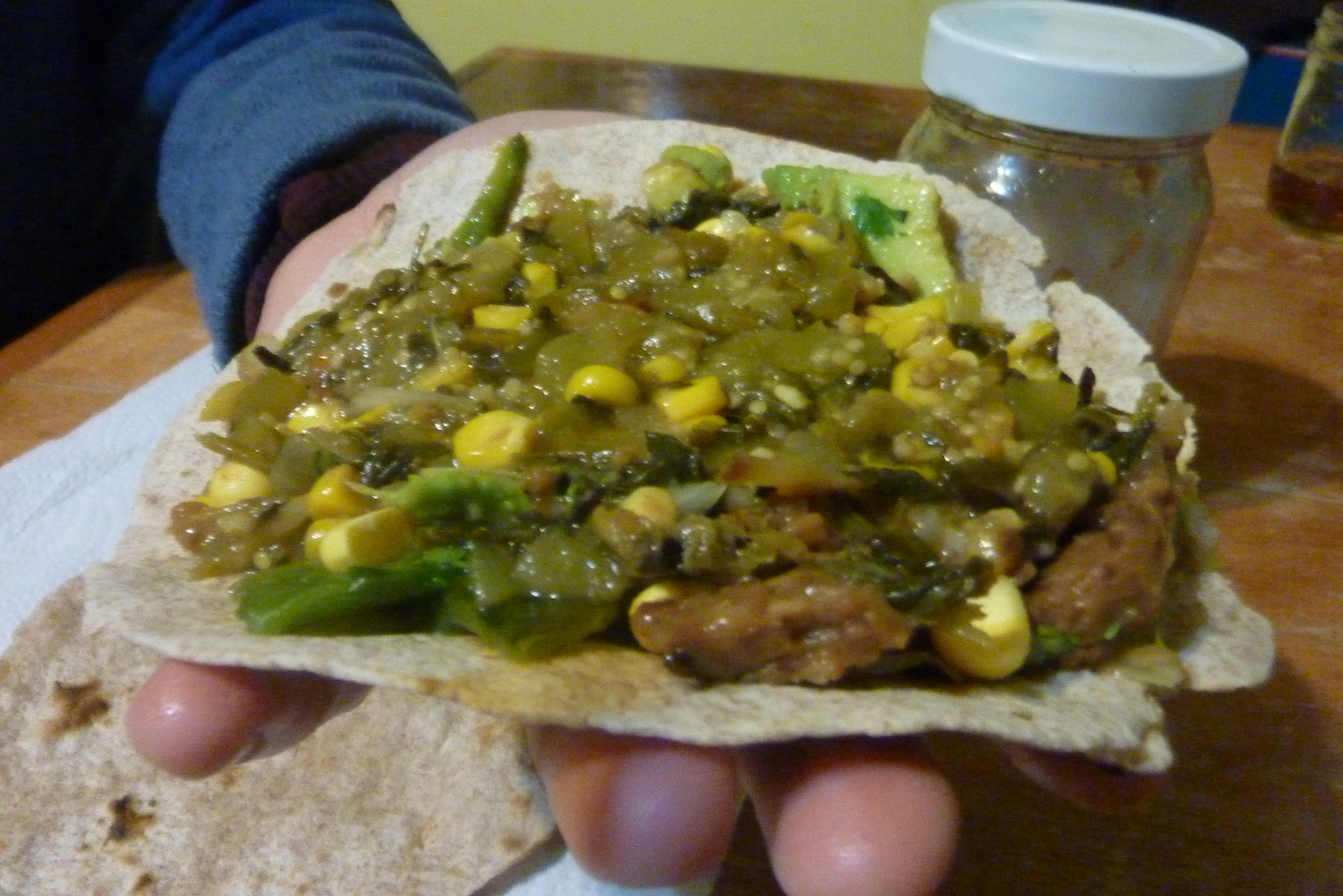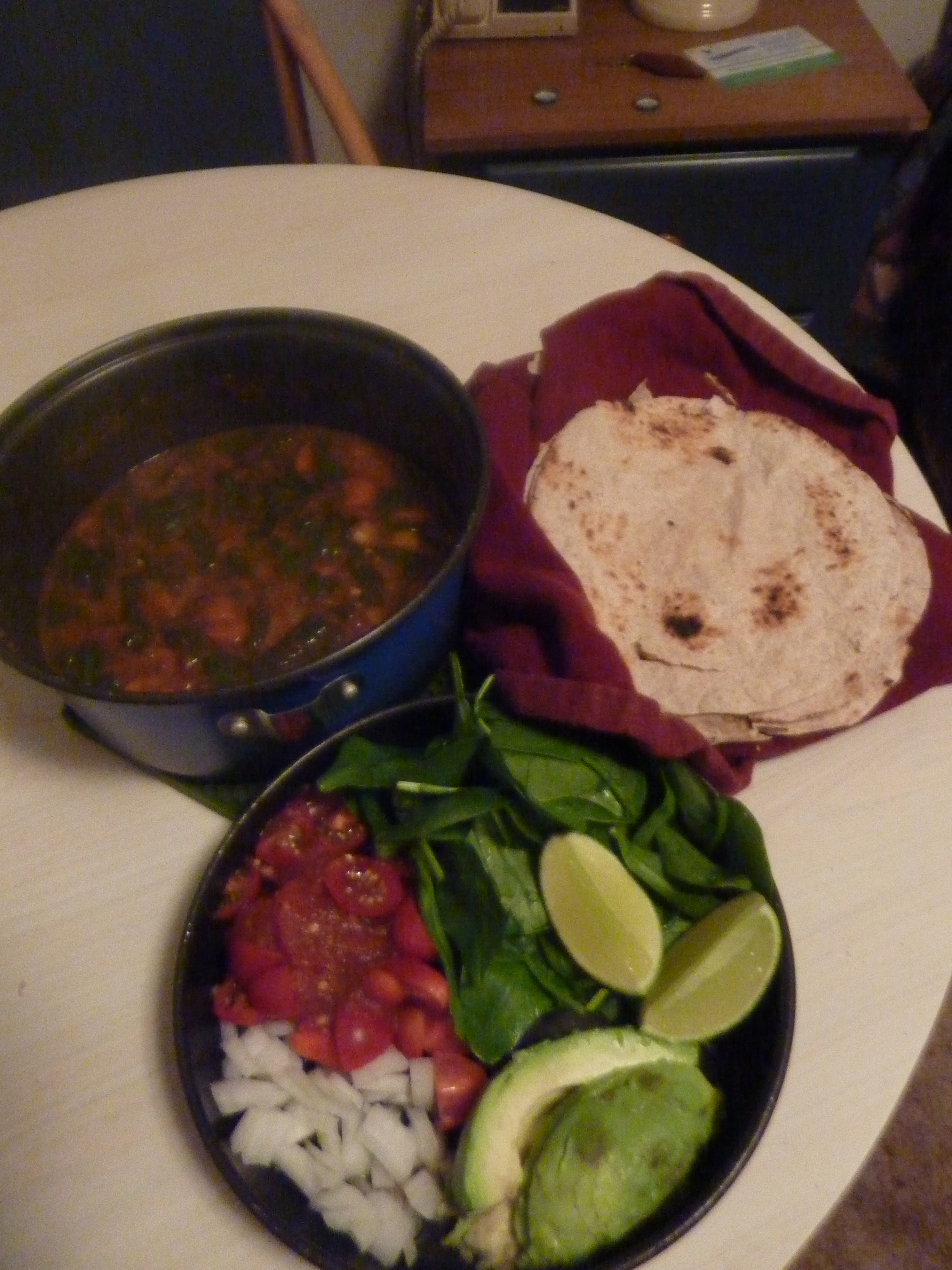 - canned goods: vegan low-sodium chili, 2 cans of mixed dark greens, black beans, salsa, garlic, and tomato sauce