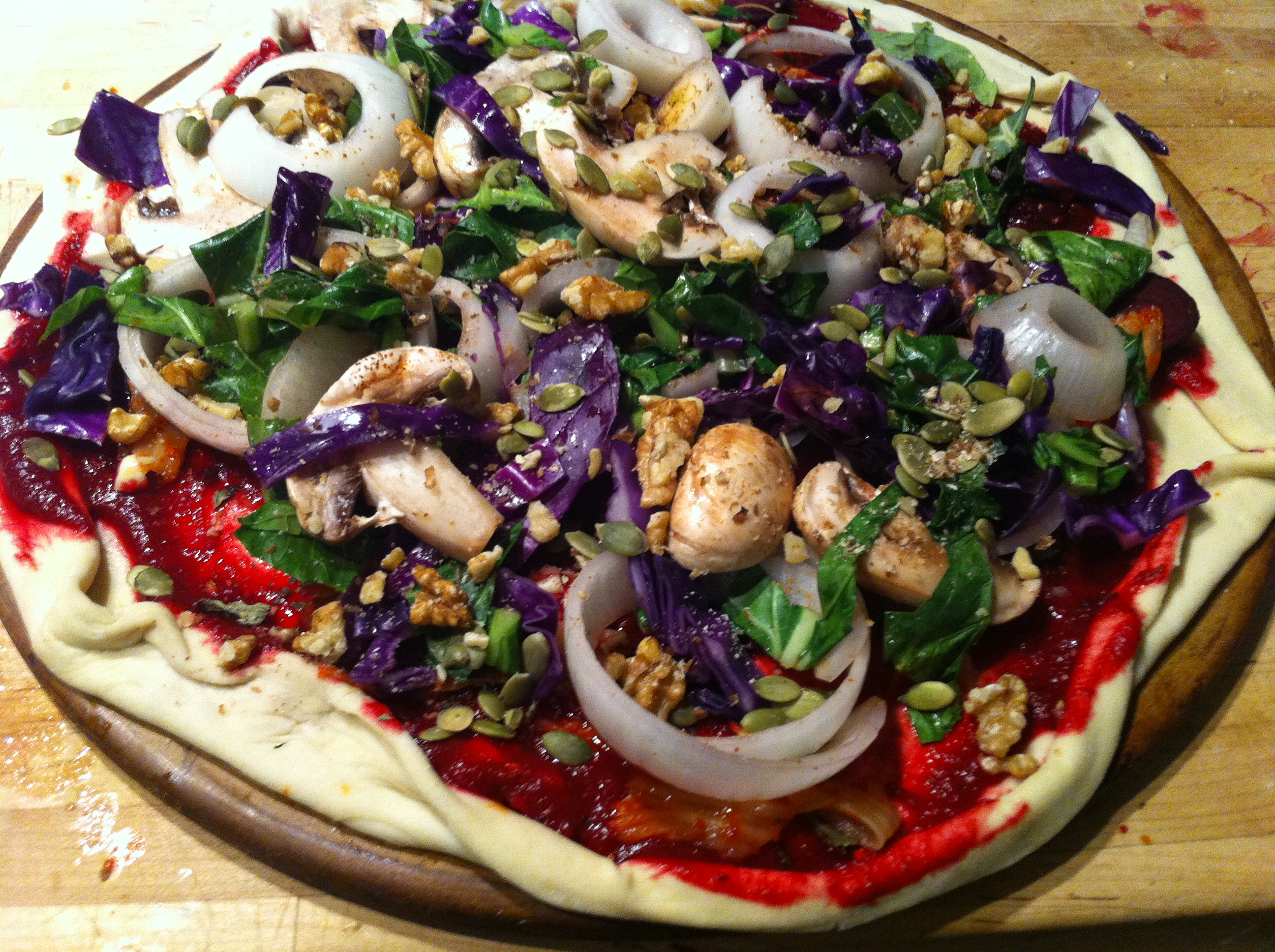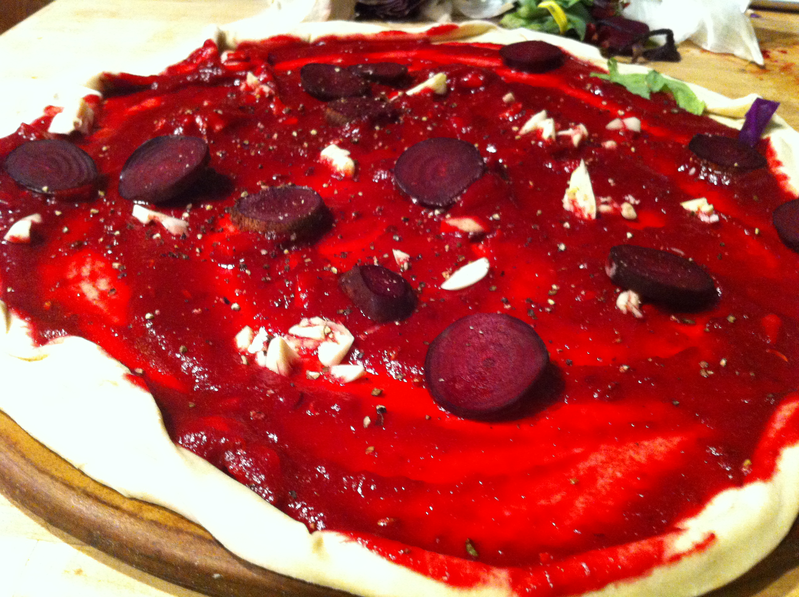 Step one: Mix tomato paste, water, 1/2 cup of beet puree (cooked beets & h20 blended up…I used the other 1/2 of the beet puree for the best quinoa dish EVER–message for recipe!) chopped garlic, cracked pepper, 1/2 tsp pf habanero sauce (for those of you that love spice, you can use anything–jalapeños, serranos, red chili flake) and dried basil together until it forms a nice pizza sauce base…flavor to taste. Spread on pizza dough.