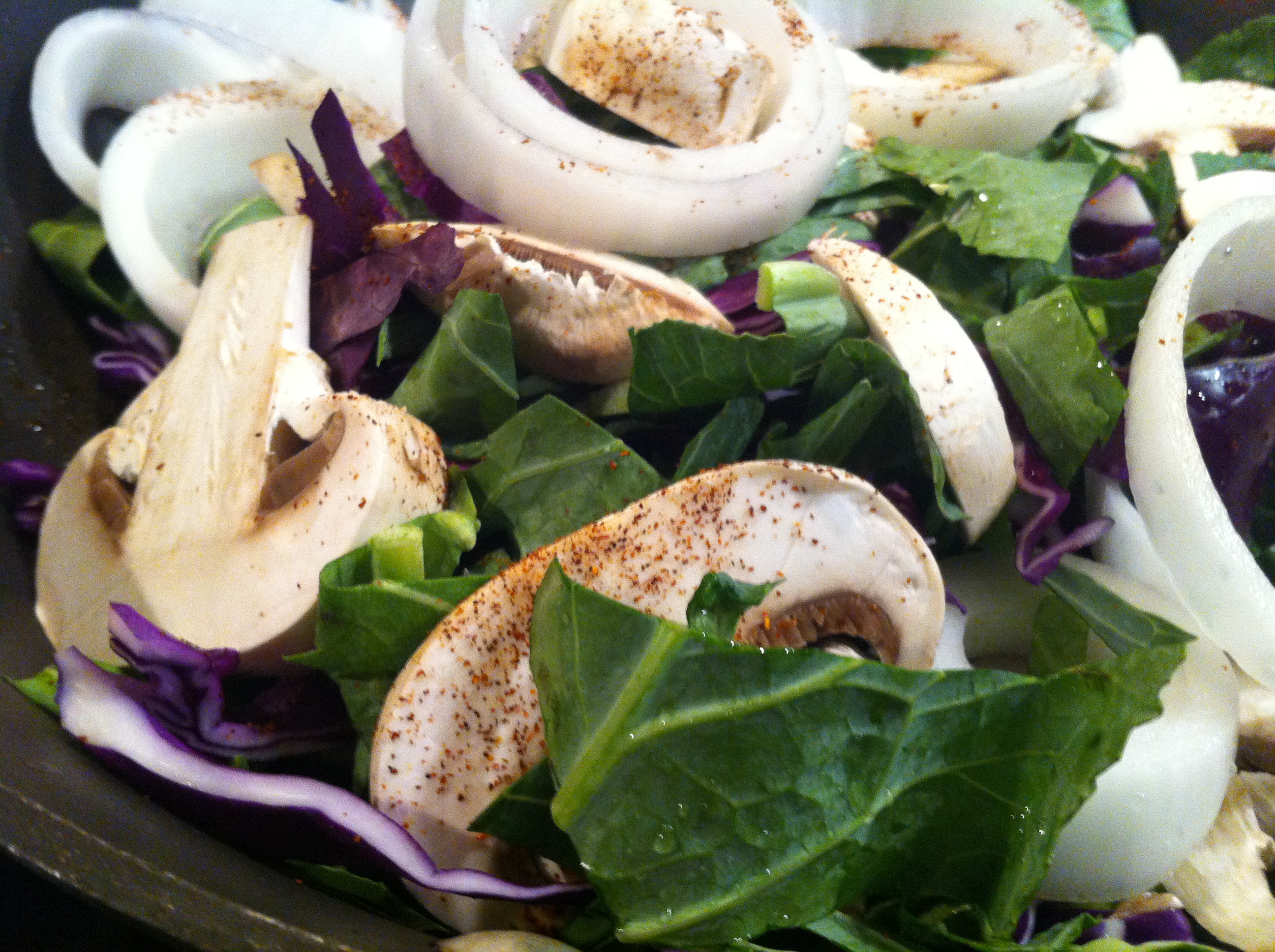 Step 2: Lightly sauté mushrooms, collards, onions, garlic, chili powder, honey, salt, and pepper in water for 1~2 minutes. This gets the veggies just warm enough to absorb the flavors but remain crisp.