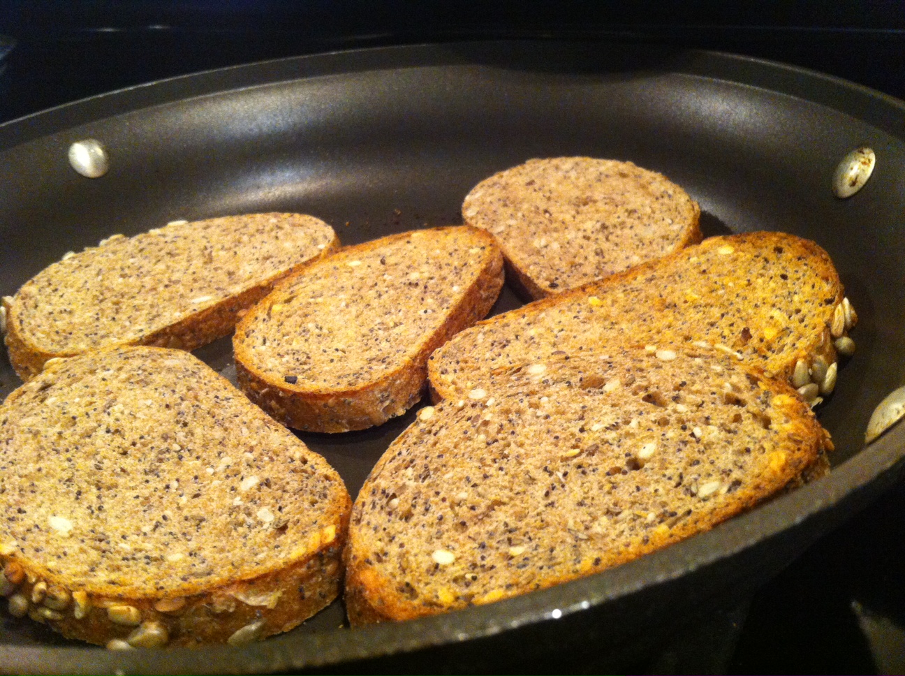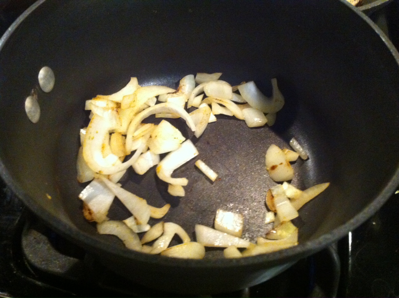 - Caramelize onions: (place onions in pan, heat on med/high, let brown, stir and add dash water, repeat for 5 minutes.)