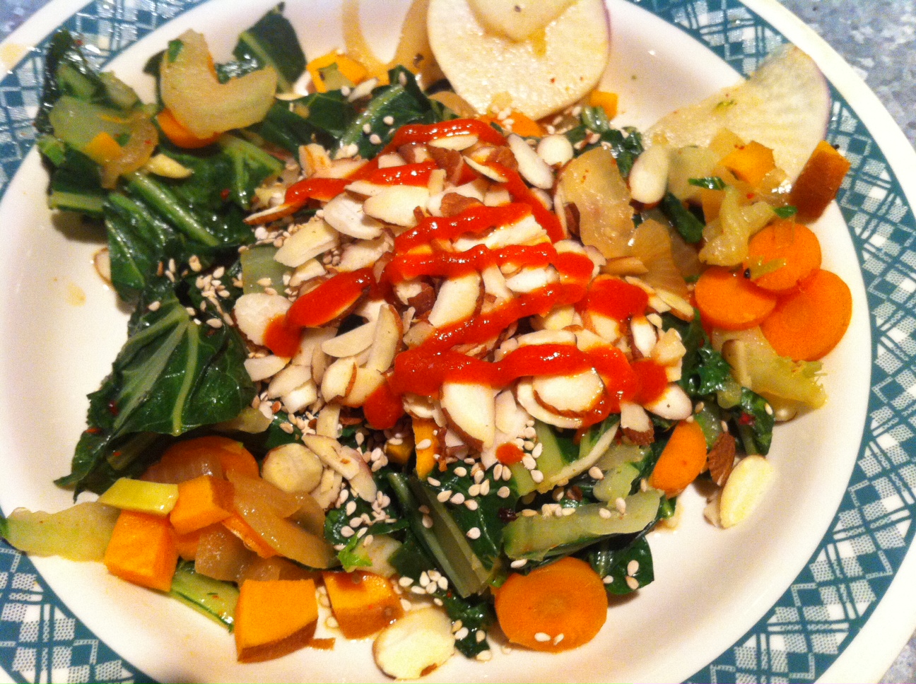 Dinner in a few quick steps: 1) toast bread. 2) prep bok choy dish–chop carrots, garlic, turnips, radishes, bok choy, and sweet p’s. 3) fresh fruit and arugula. 4) sides: kimchi and thai curry hummus