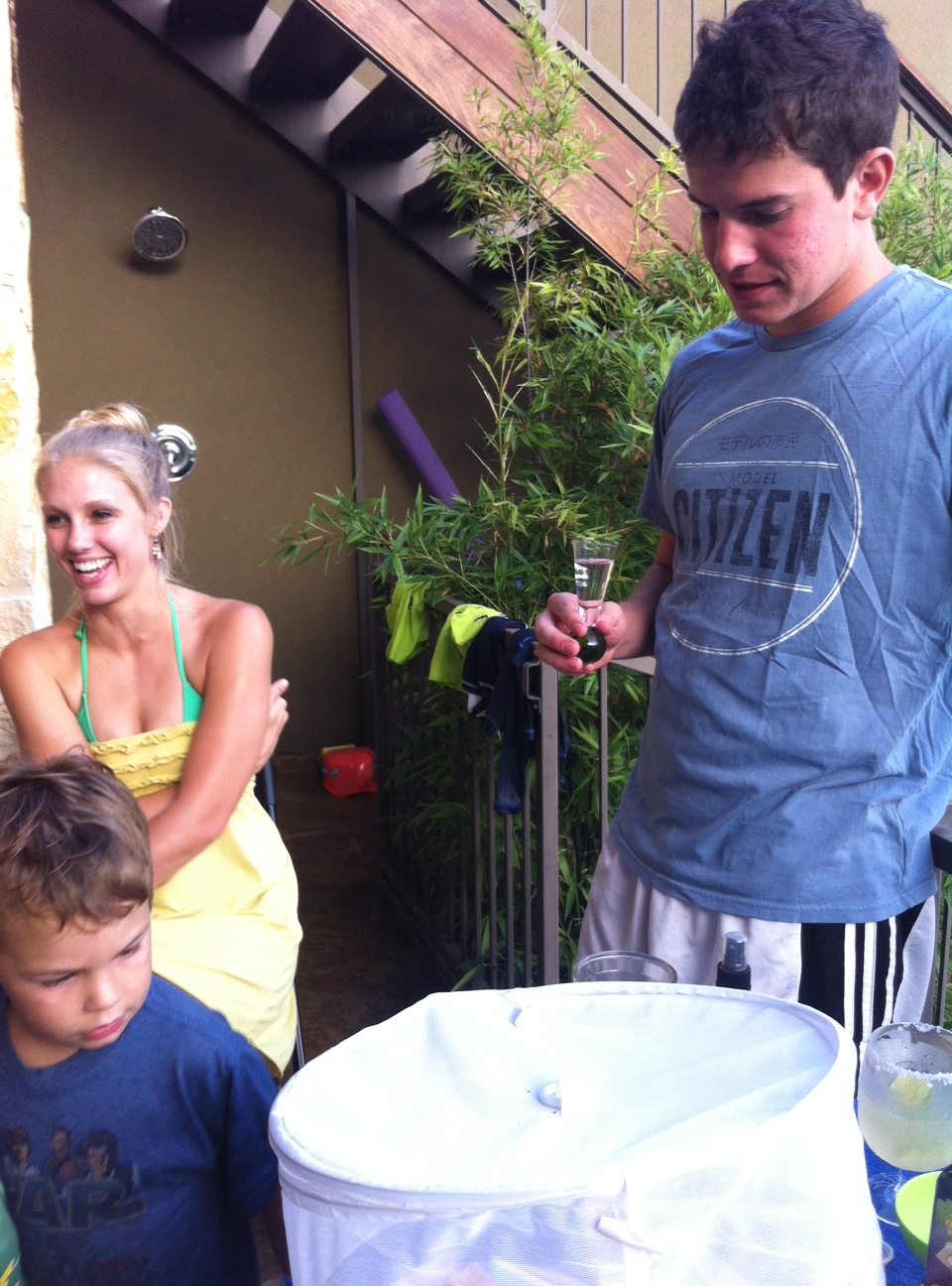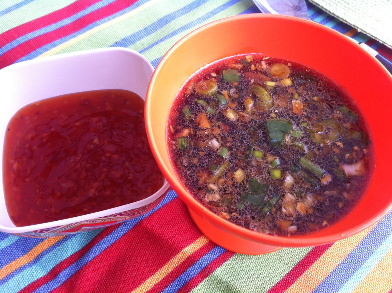 A gas grill, a huge pot, tongs and a ladle, tons of local fresh greens, mushrooms, onions, squash, potatoes and dipping sauces (Ponzu & sweet chili ginger).