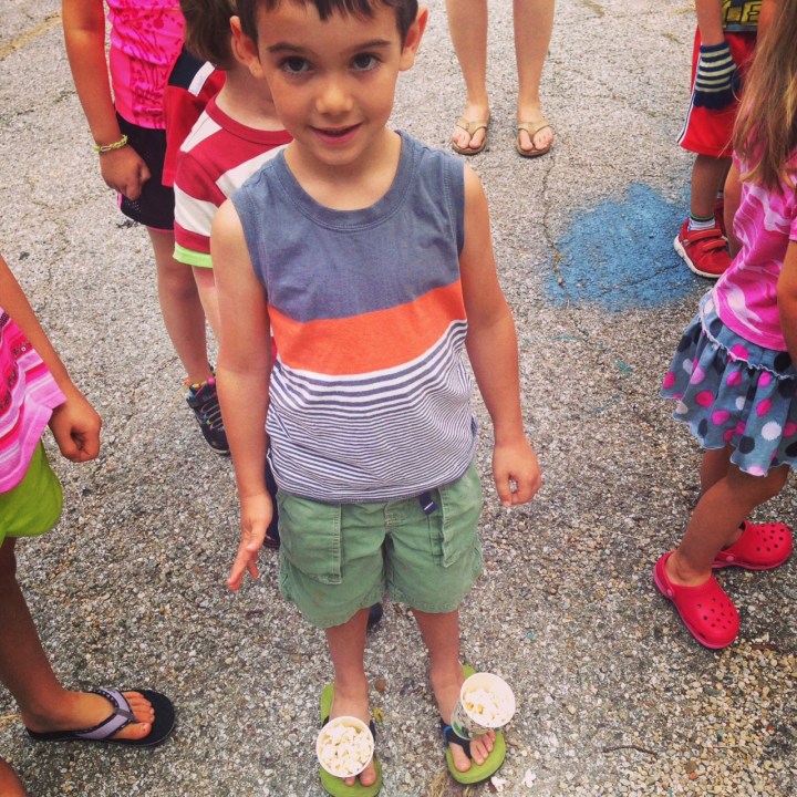The kids were placed on two teams. The first person in each line had cups rigged to their shoes (rubber bands and paper clips) and had to carefully run/walk the popcorn filled cups to the opposite end of the yard to dump the popcorn onto the tray. Since the kids were little bitties (3-5 yrs) there was no winner but lots if silly fun.