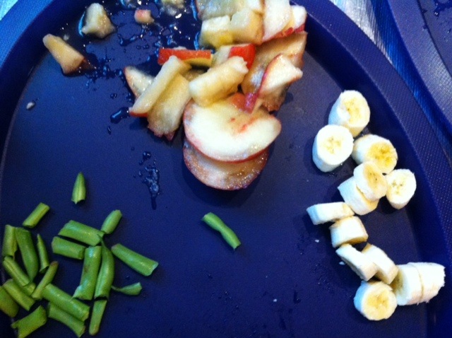 After the game, we washed hands and got back into groups. Each group was given some fruit or veggies to cut with plastic knives. This was a great opportunity to teach basic knife skills. We discussed the colors, textures, smells, similarities/differences, and taste. Each group prepared a plate to share with the class. We ate together and revisited MyPlate principles.