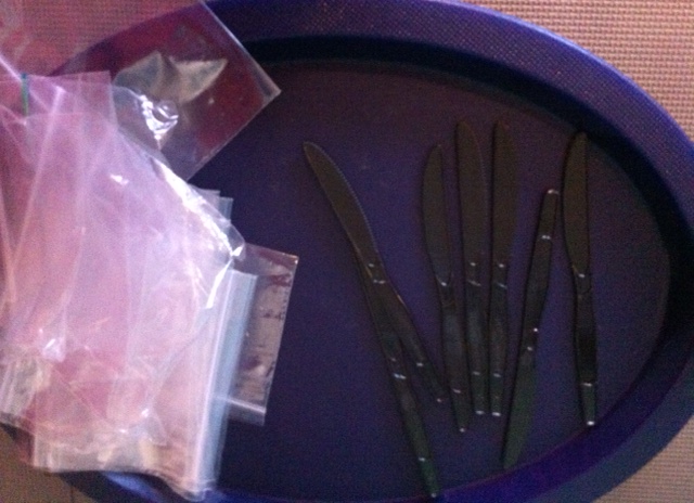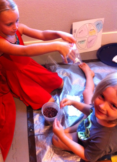 Next we divided into groups where we colored and cut the myplate foods from the handout and then placed the cutouts on the appropriate myplate section (as practice for the game.) We also made our own bean bags by placing even amounts of the beans into a baggie and one food cutout.