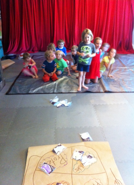 Game time!! The students toss the bag onto the large MyPlate butcher paper. If the bean bag lands on the correct section, that team gets a point.