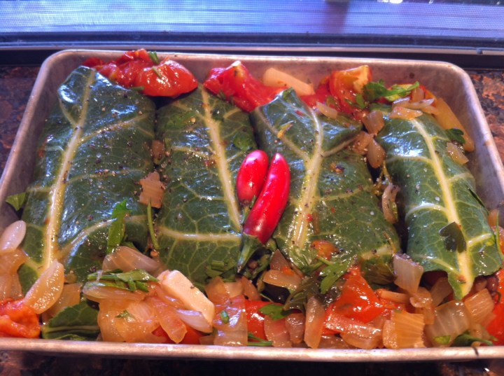 Ooh I would love the recipe to the stuffed greens! Are those collard greens? Looks yummy!