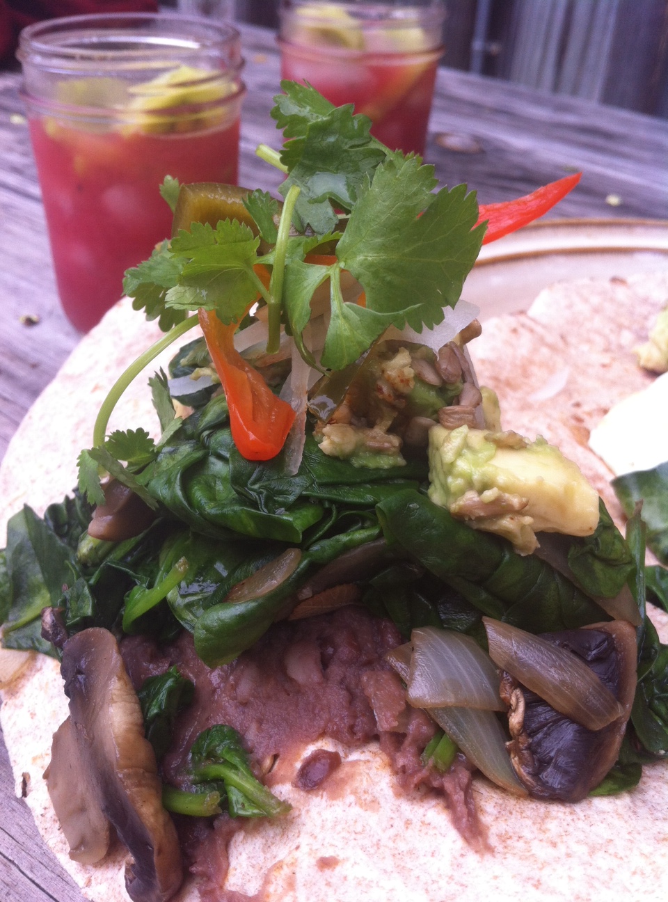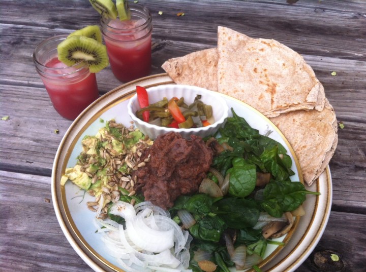 Caramelize onions in pan on high heat. Then sauté with mushrooms, garlic, 1/2 tsp of tamari and sprinkle in a few caraway seeds. Add a little water if needed. Turn off heat and add spinach. Toss & Cover then set aside. Serve with avocados, sunflower seeds, toasted whole grain tortillas, pickled peppers, fresh onions and refried blk beans and chili powder.
