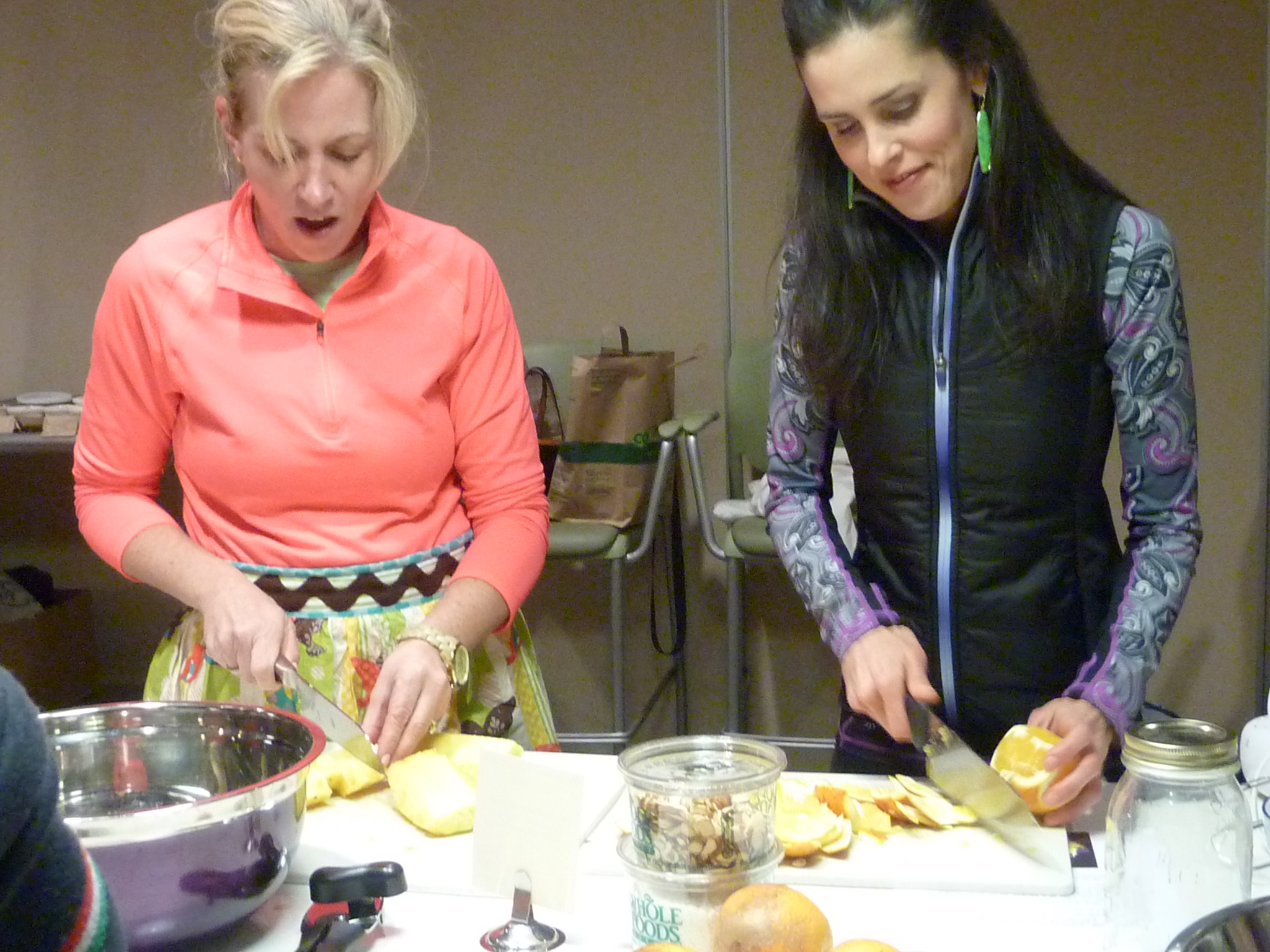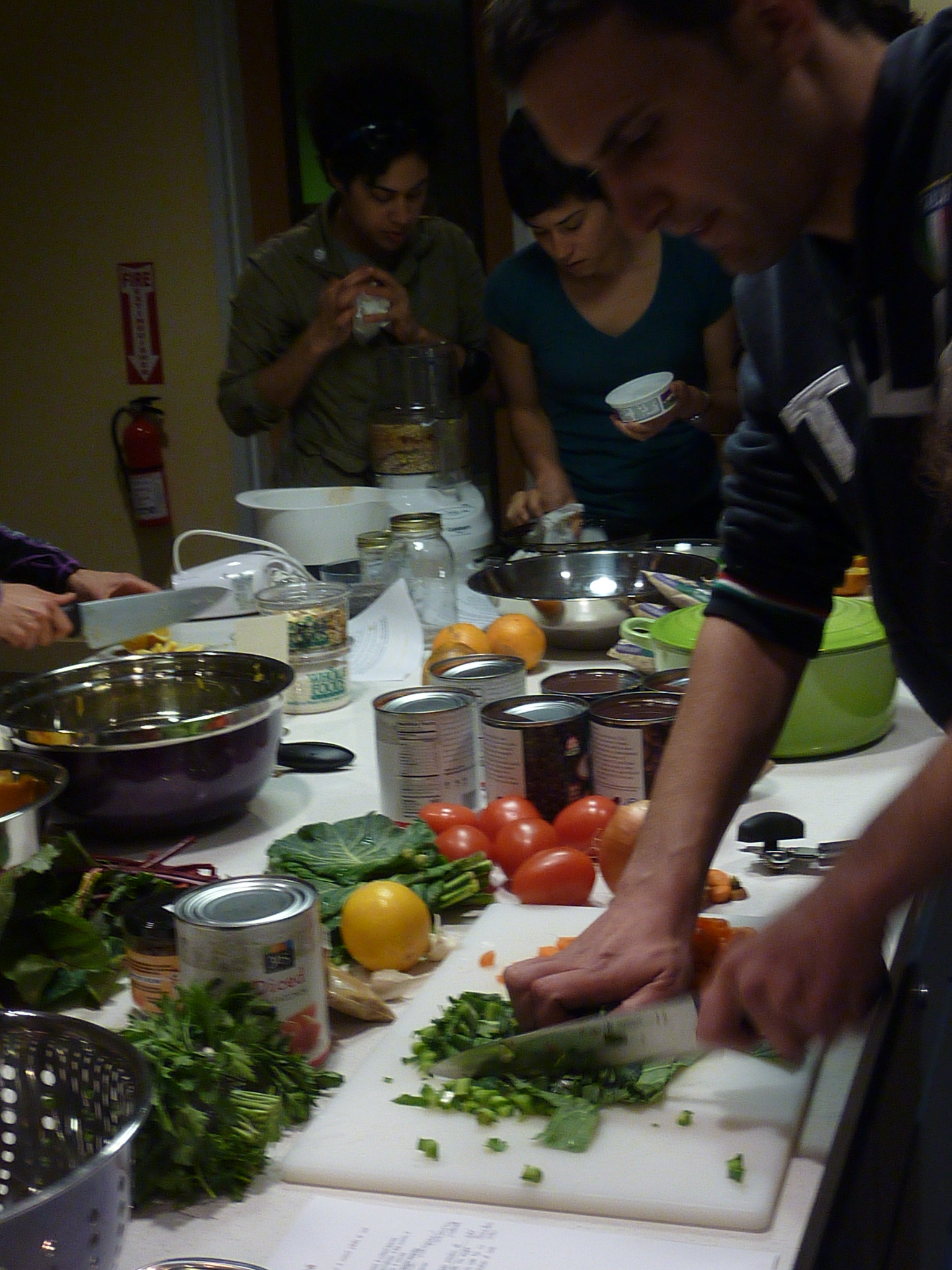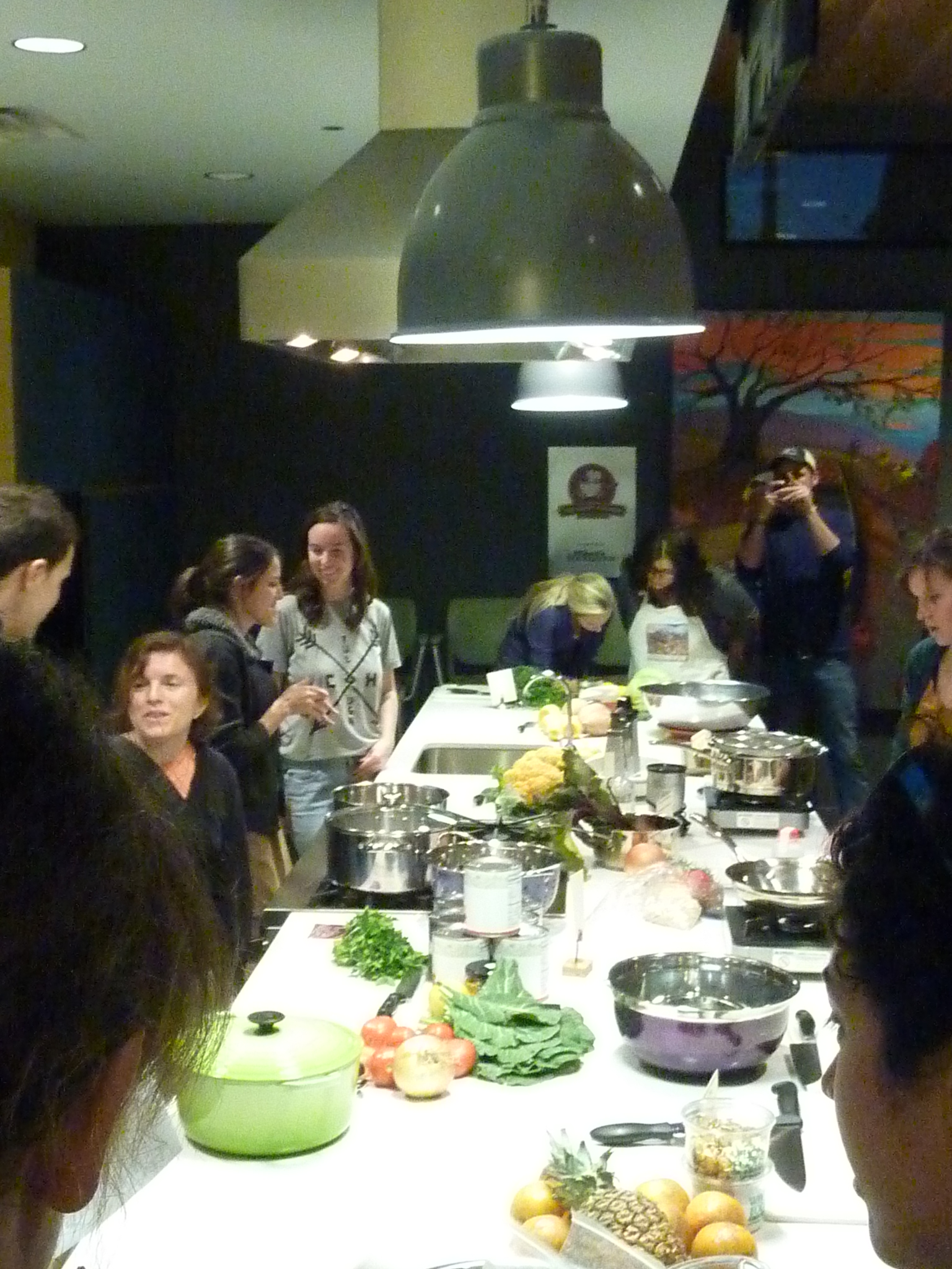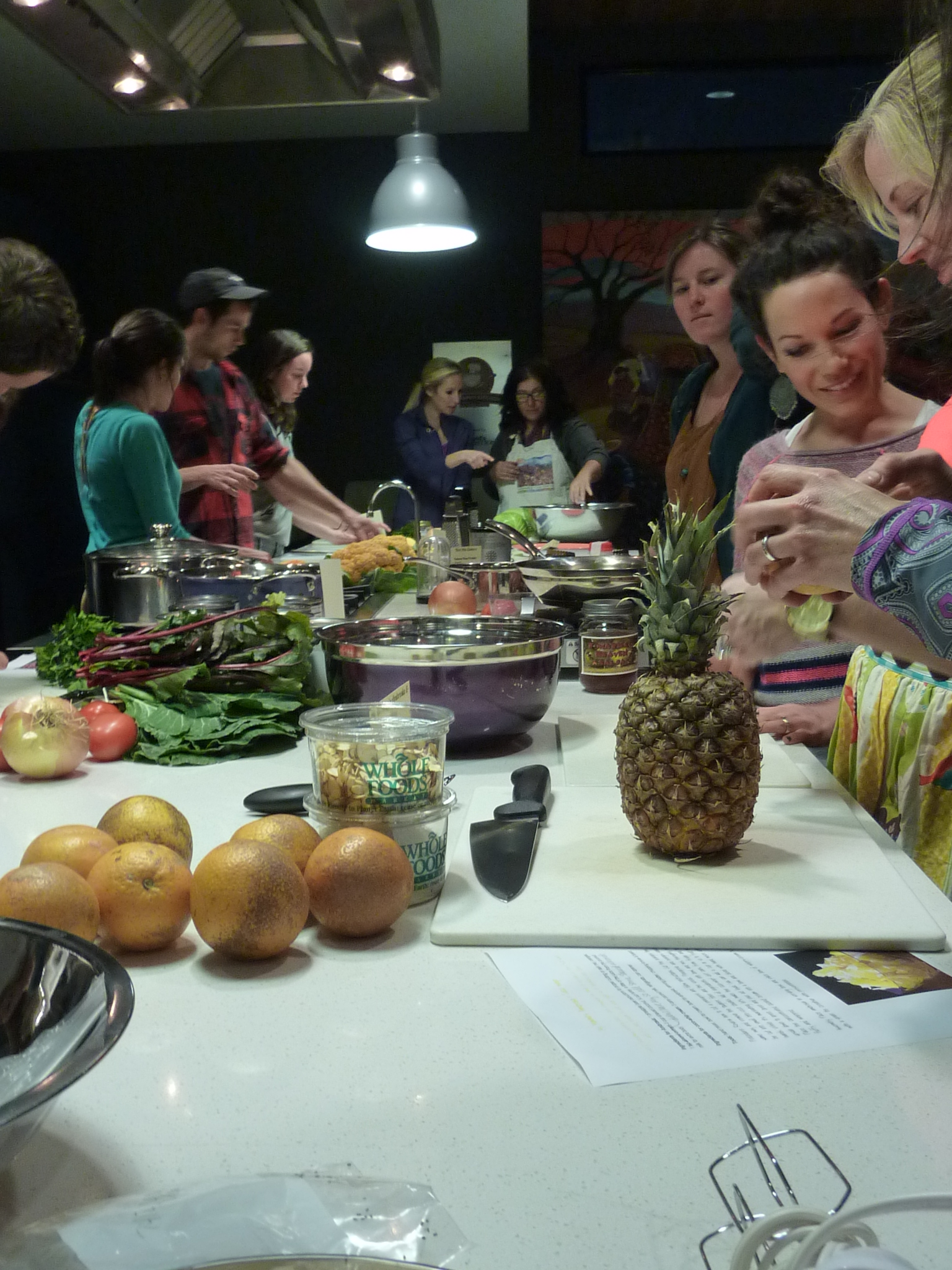 The group is numbered off and each number coordinates with the dish that group will be creating. After being told to focus on conscious cooking, cooking with love, and making each dish a work of art…the attendees are set-free and the room erupts with energy.