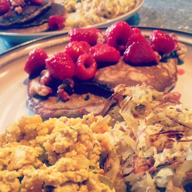 Buckwheat pancakes with toasted walnuts and warm raspberries