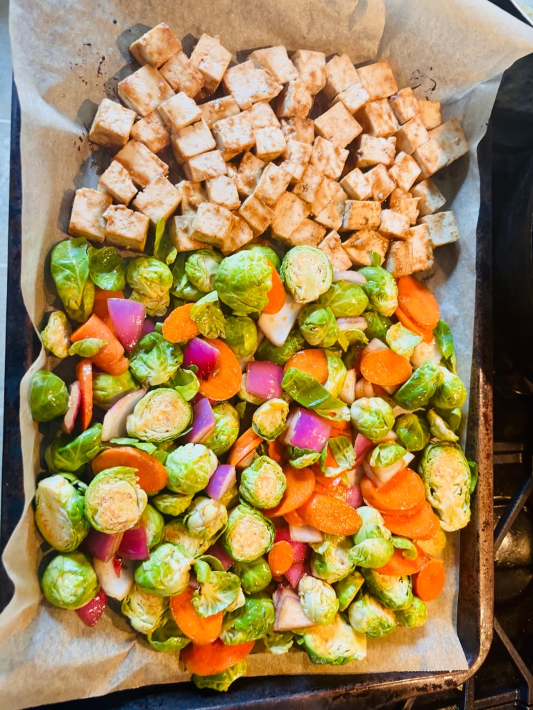 Bake for 15 minutes. - Prep the veggies while tofu is baking: