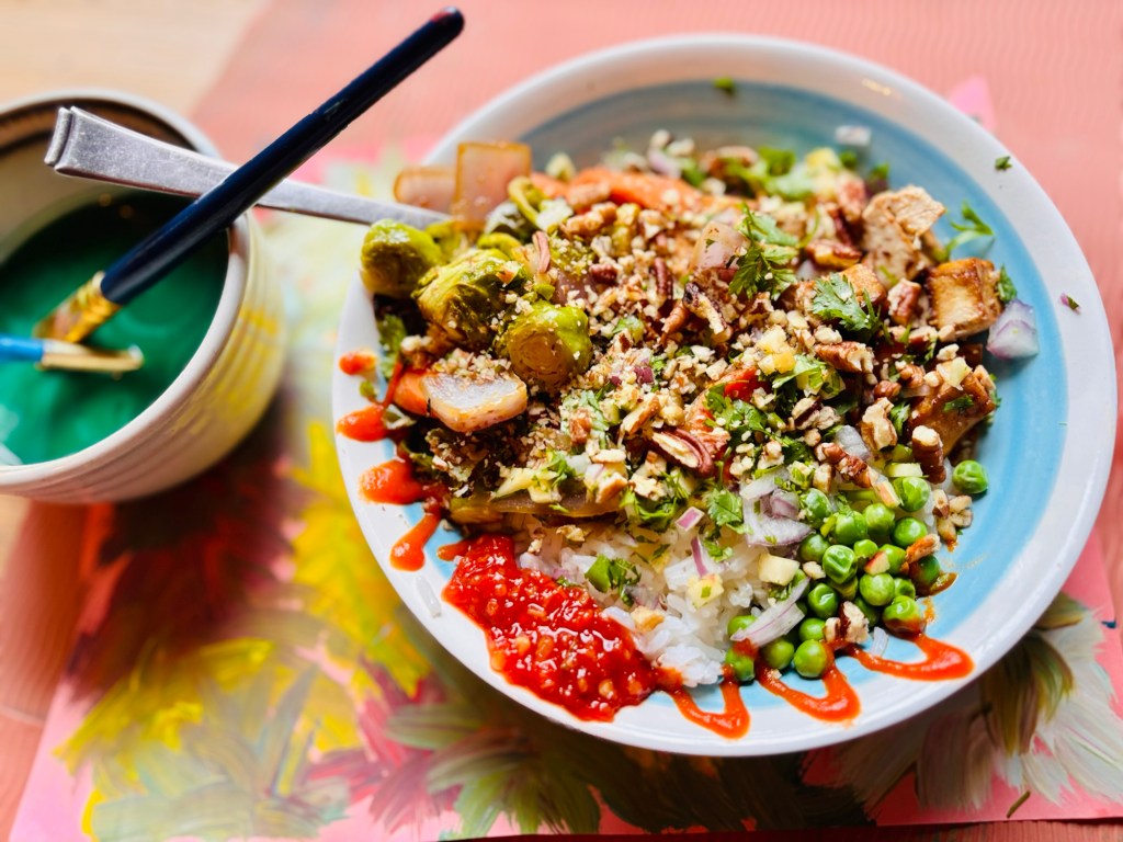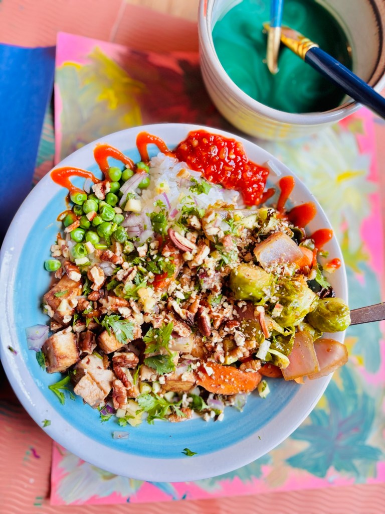 Rice+Tofu+Carrots+Peas+Red Onions+Brussels+Pecans+Apples+Cilantro=Happy.