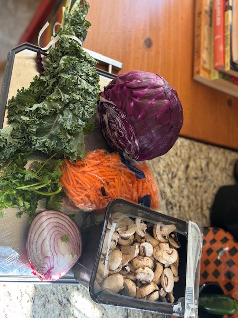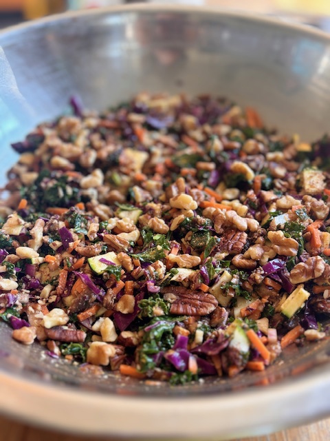 In a large bowl, combine the mushrooms, kale, zucc, carrots, cabbage, onion, and beans. Add chopped pecans and walnuts. Toss with balsamic, soy sauce, lime juice, and all seasonings including nutritional yeast. Mix thoroughly. - Sauté for Flavor:
