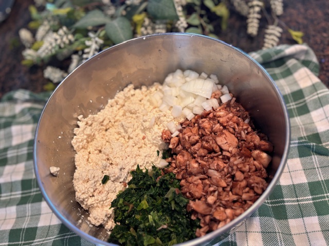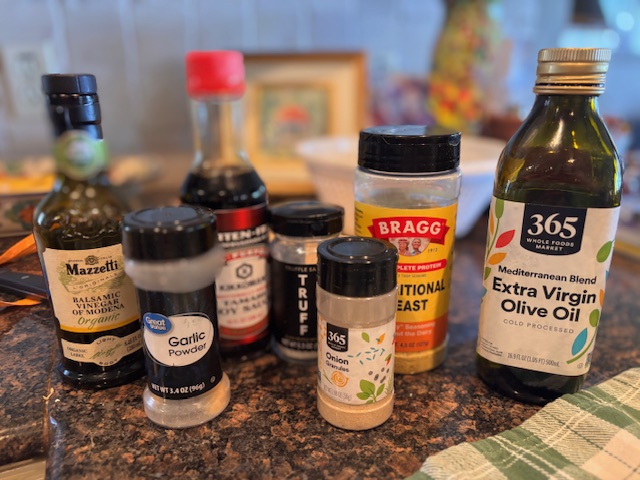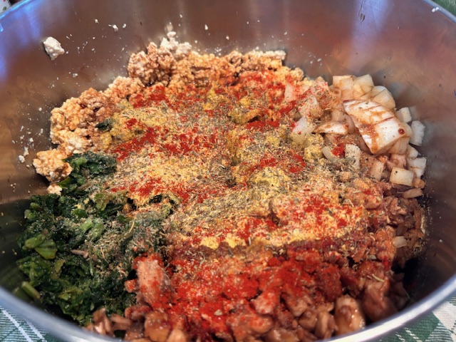 Combine tofu, mushrooms, onions, and spinach in a large bowl. Add seasonings generously: balsamic reduction, soy sauce, a large pinch or two of truffle salt, Italian seasoning, 1/3 to 1/2 cup nutritional yeast, granulated garlic, granulated onion, and paprika. Mix thoroughly. - Layer the lasagna: