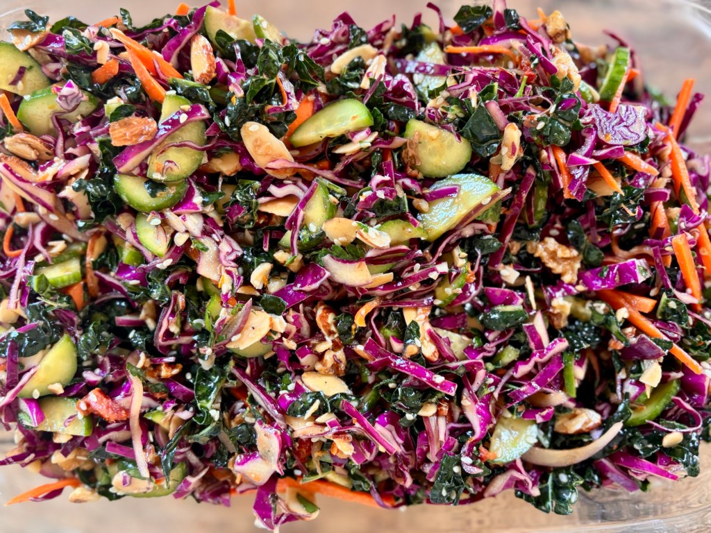 One of the best parts? It keeps getting better as it sits. Kale and cabbage are sturdy cruciferous veggies that actually benefit from some marinating time. The longer they soak up the dressing, the deeper the flavor.