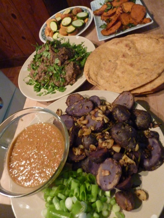 Homemade refried beans+spicy sweet potatoes+fresh green onions+baby spinach+Mark’s roasted salsa+browed garlic and rosemary purple potatoes+Zucchini and carrots+tortillas= Killer burritos! The key to making burrito tapas is to have small plates of different dishes (simple and easy dishes) in which you use to make your perfect burrito. Salsa, beans, and good toasted tortillas are a must. […]