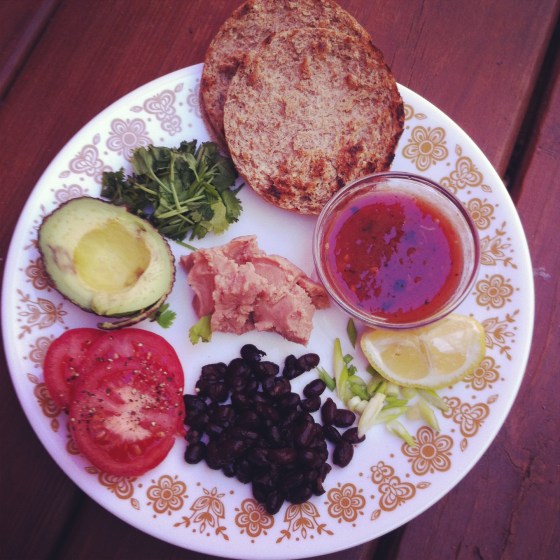 Whole grain English muffin plate…a fast and satiating way to eat a well-balanced breakfast or lunch. Toast all sides of the whole grain muffin 1/4 an avocado Tomato slices Fat-free, low sodium refried beans Whole black beans Fresh cilantro Green onions Cracked pepper Lemon juice Mexican Oregano Spicy salsa Enjoy!